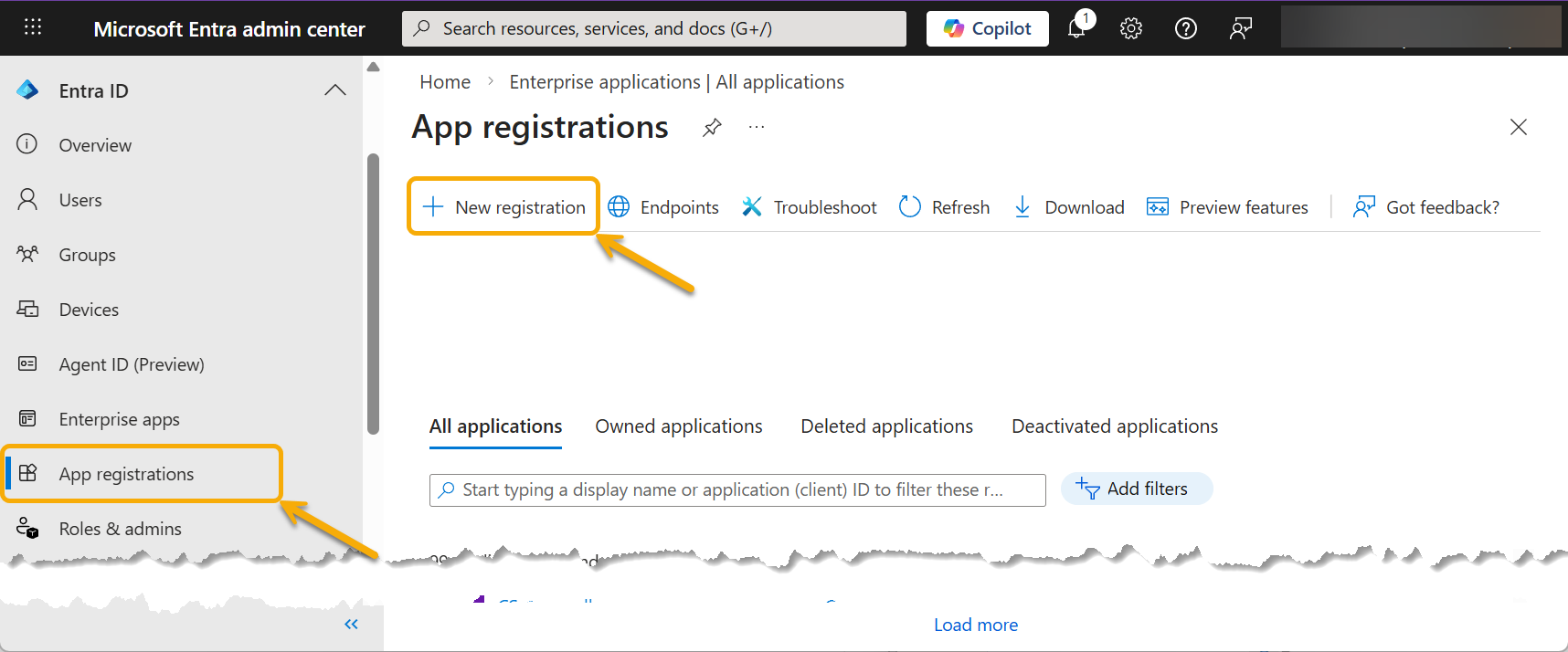 - Browse to Entra > App registrations, and select New registration.