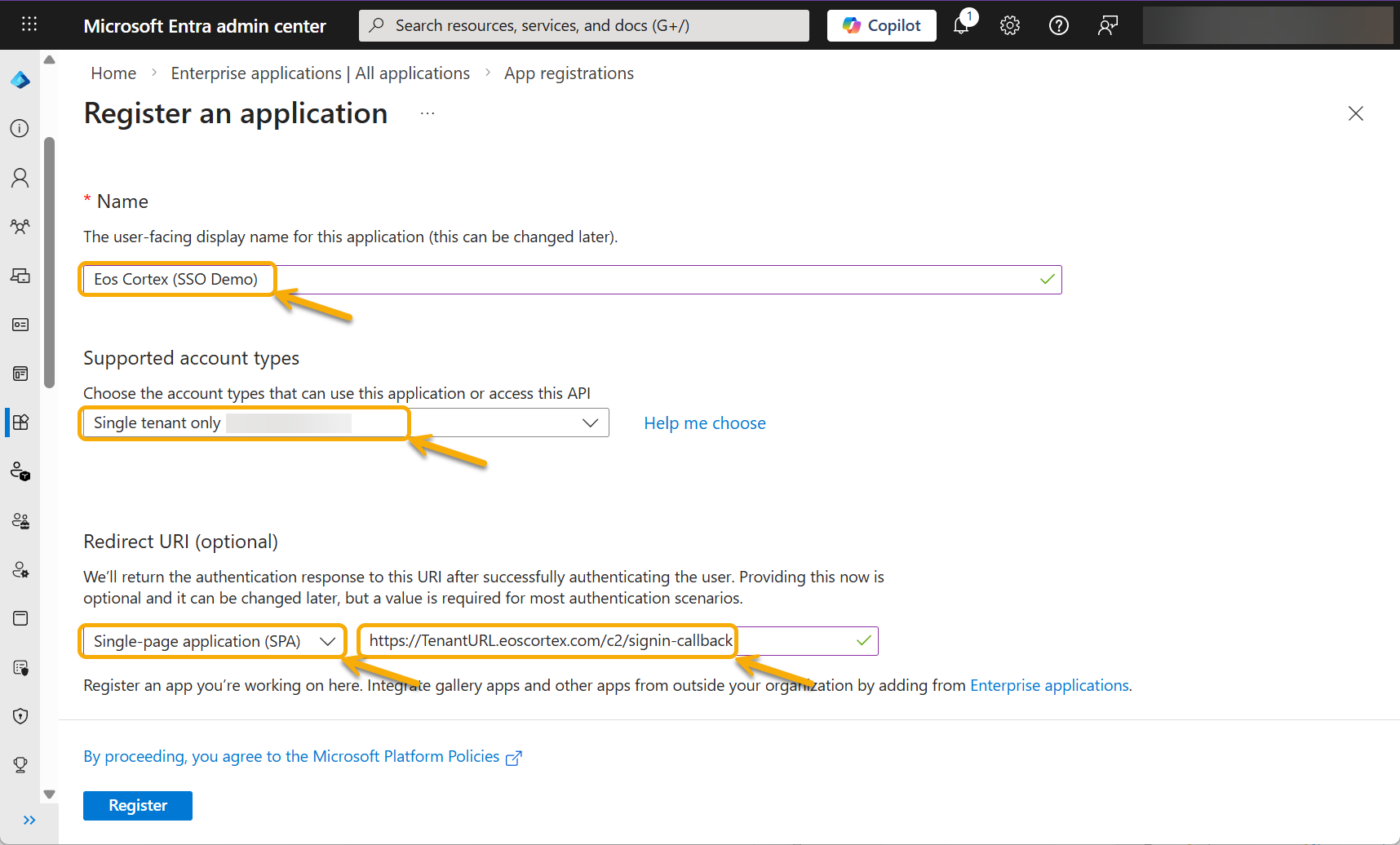 - Redirect URI: https://%your Tenant name%.eoscortex.com/c2/signin-callback
