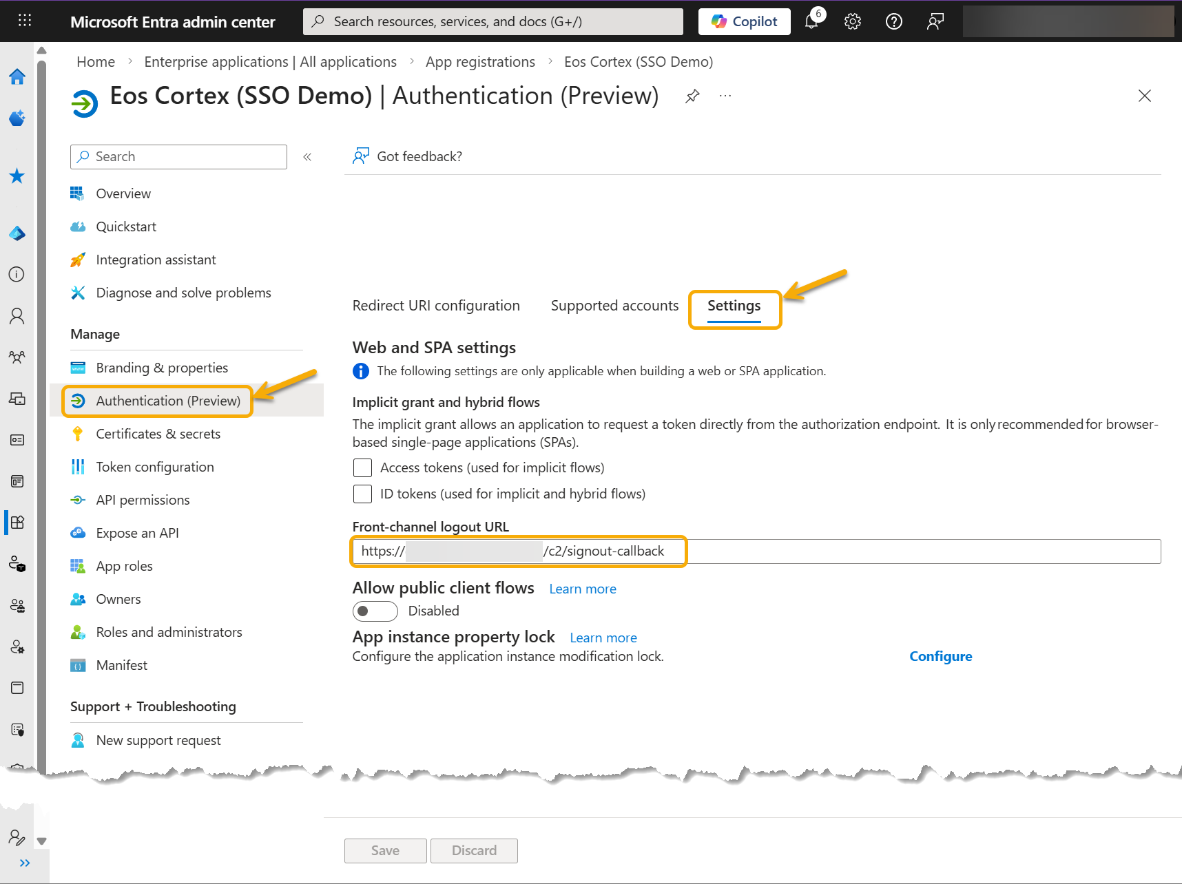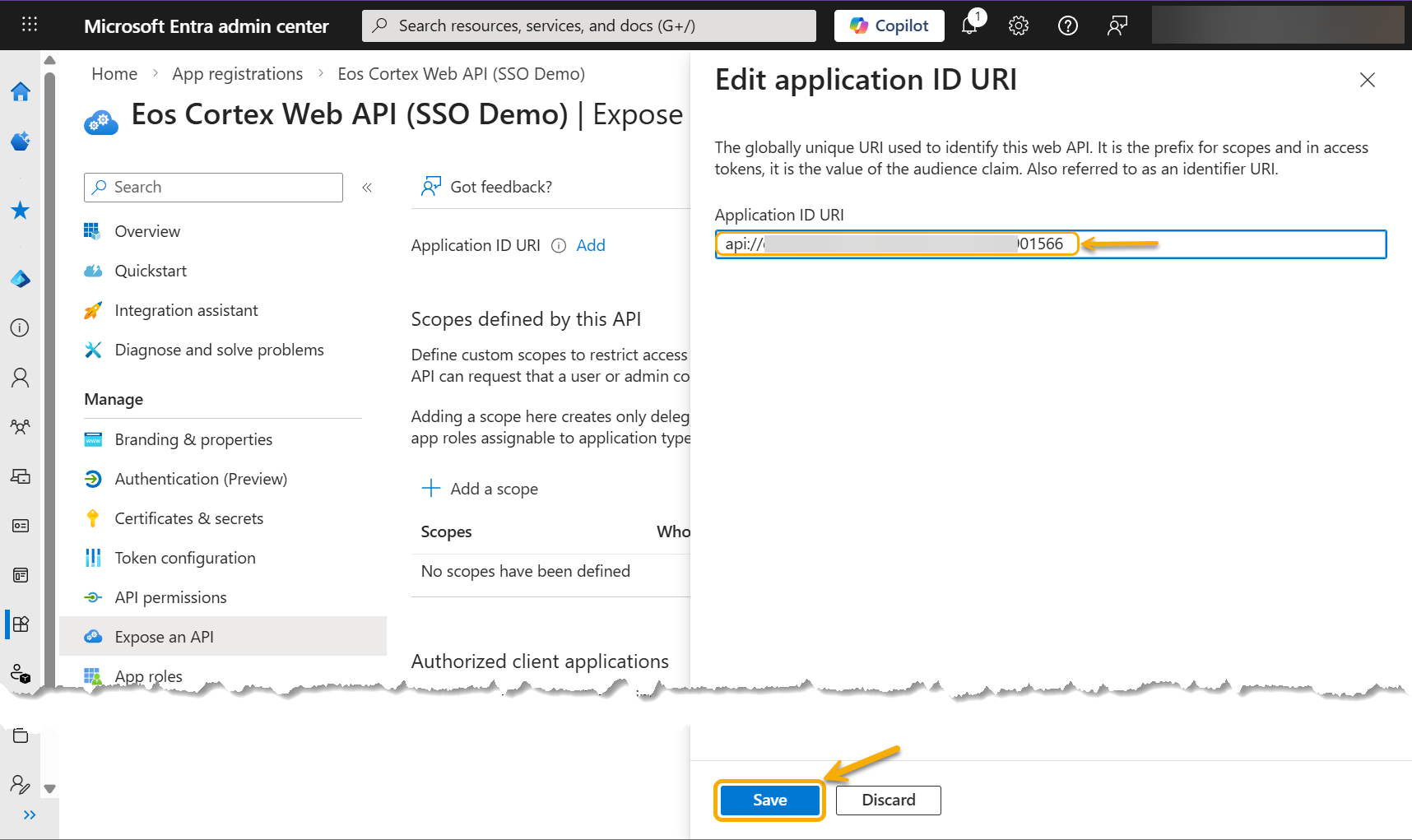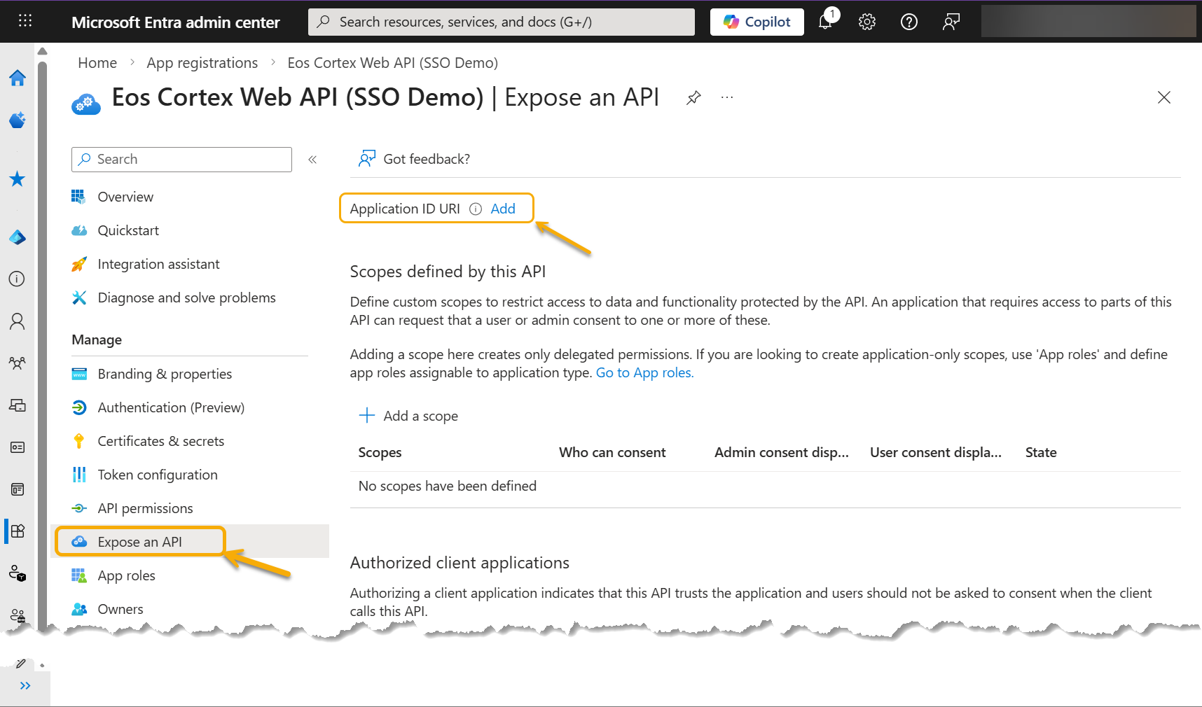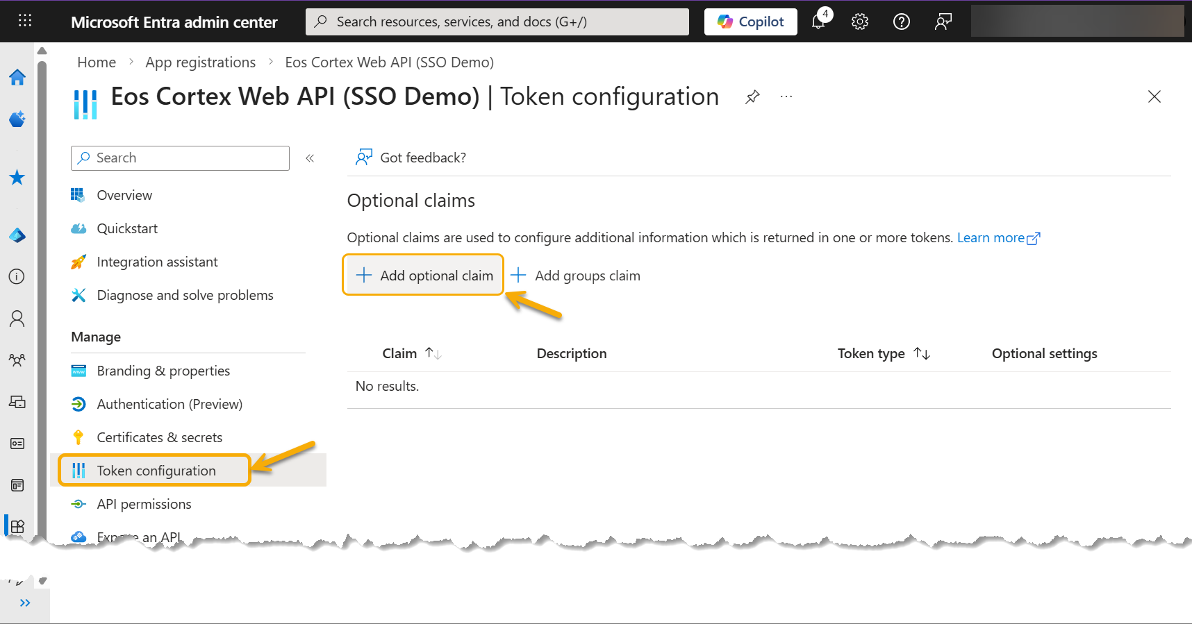 - Navigate back to the first Entra app created [ex: Eos Cortex (SSO Demo)]
