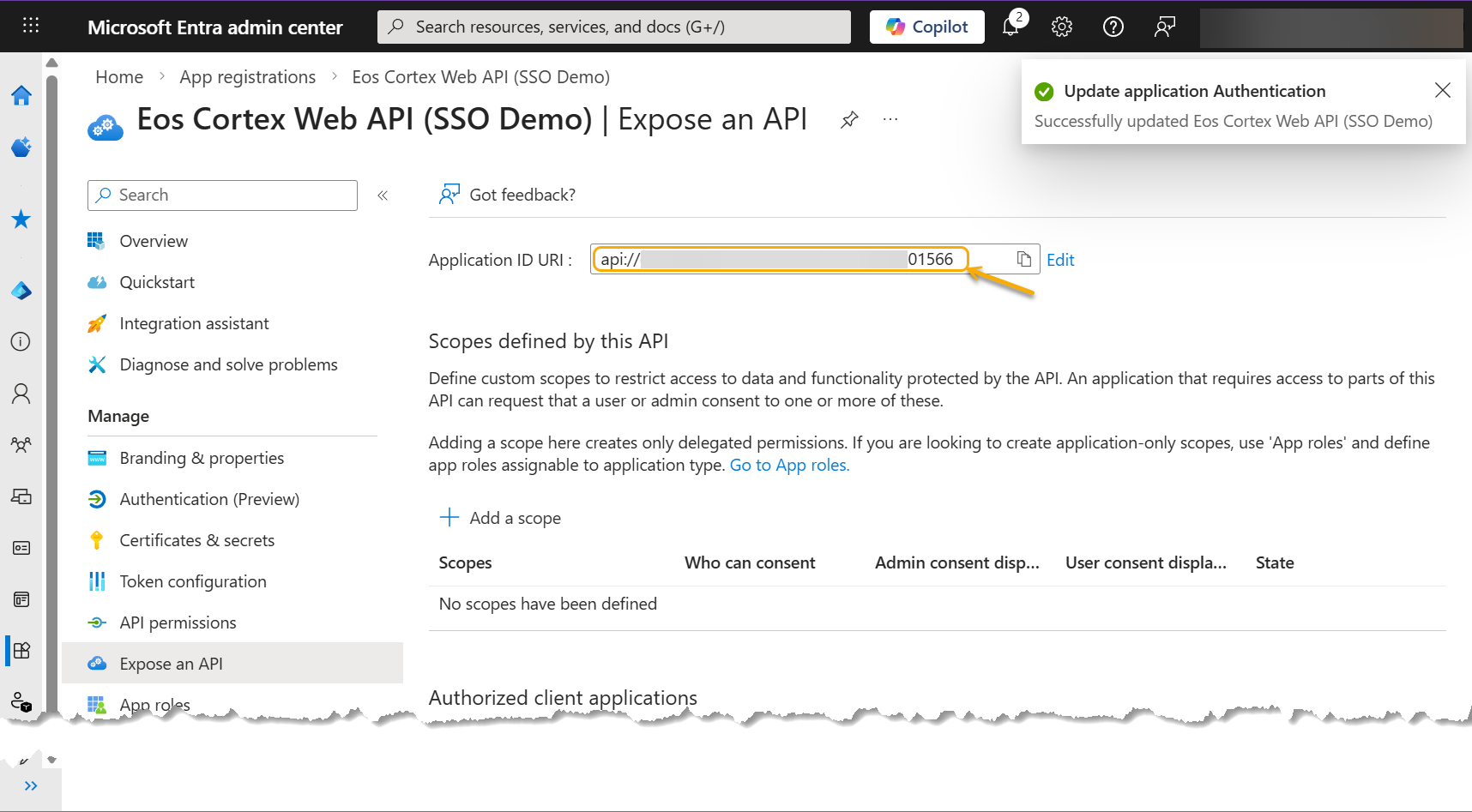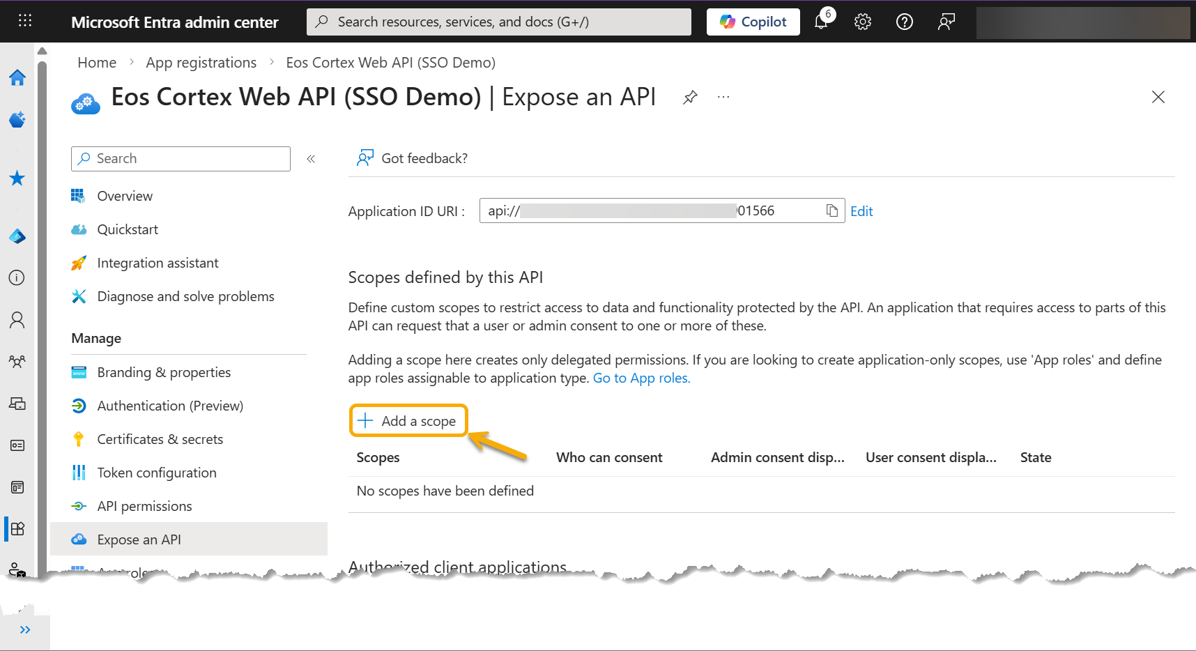 Note: Record the Application ID URI. (for use in the Eos Cortex > Authentication settings - see Section 4, below) - Select Add a scope...