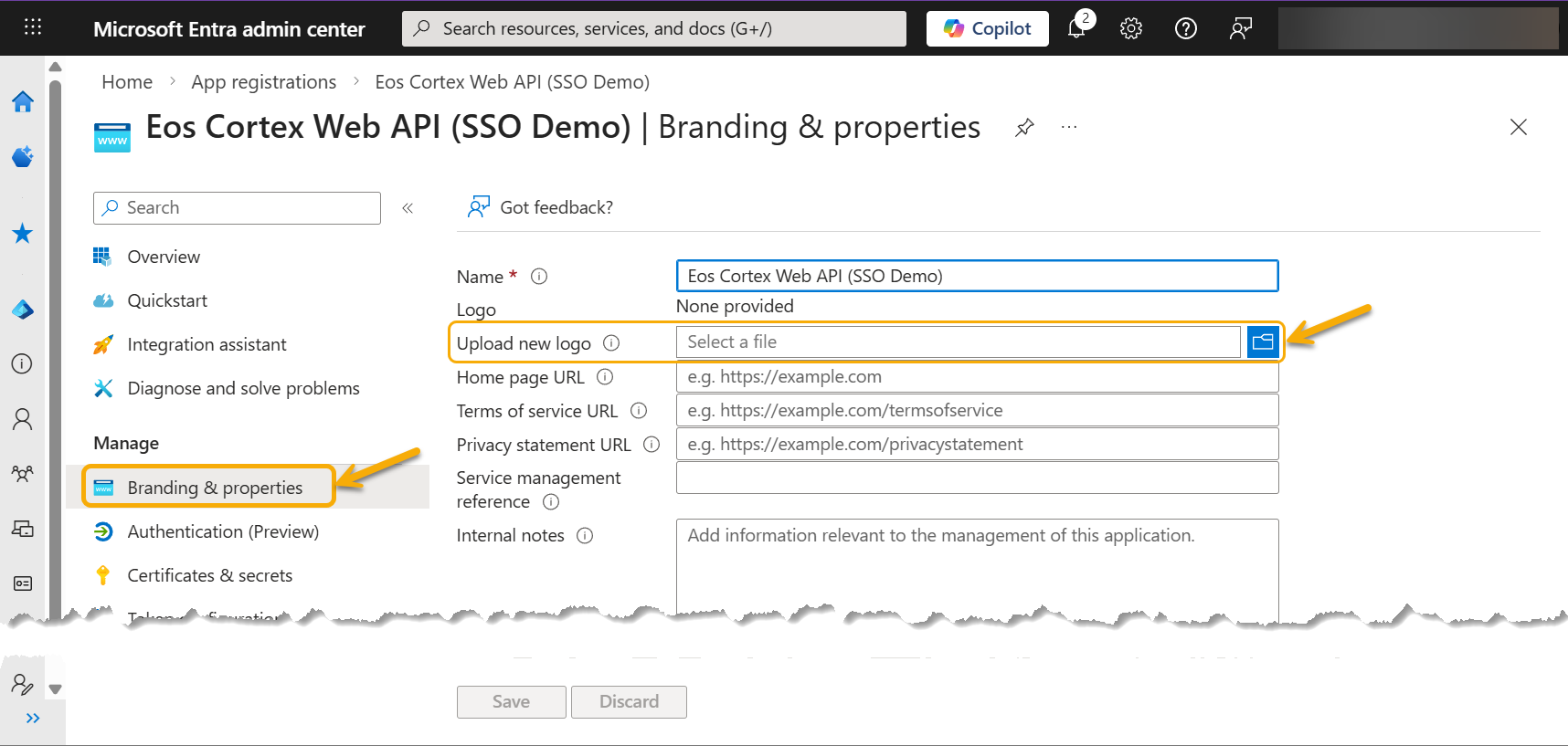 Note: Record the Application ID URI. (for use in the Eos Cortex > Authentication settings - see Section 4, below) - At the Branding & properties, select Upload new logo, and select the "Eos Cortex" logo at the bottom of this solution, and select Save.