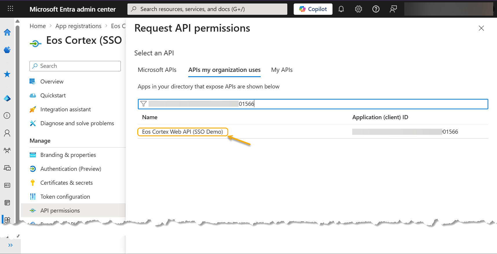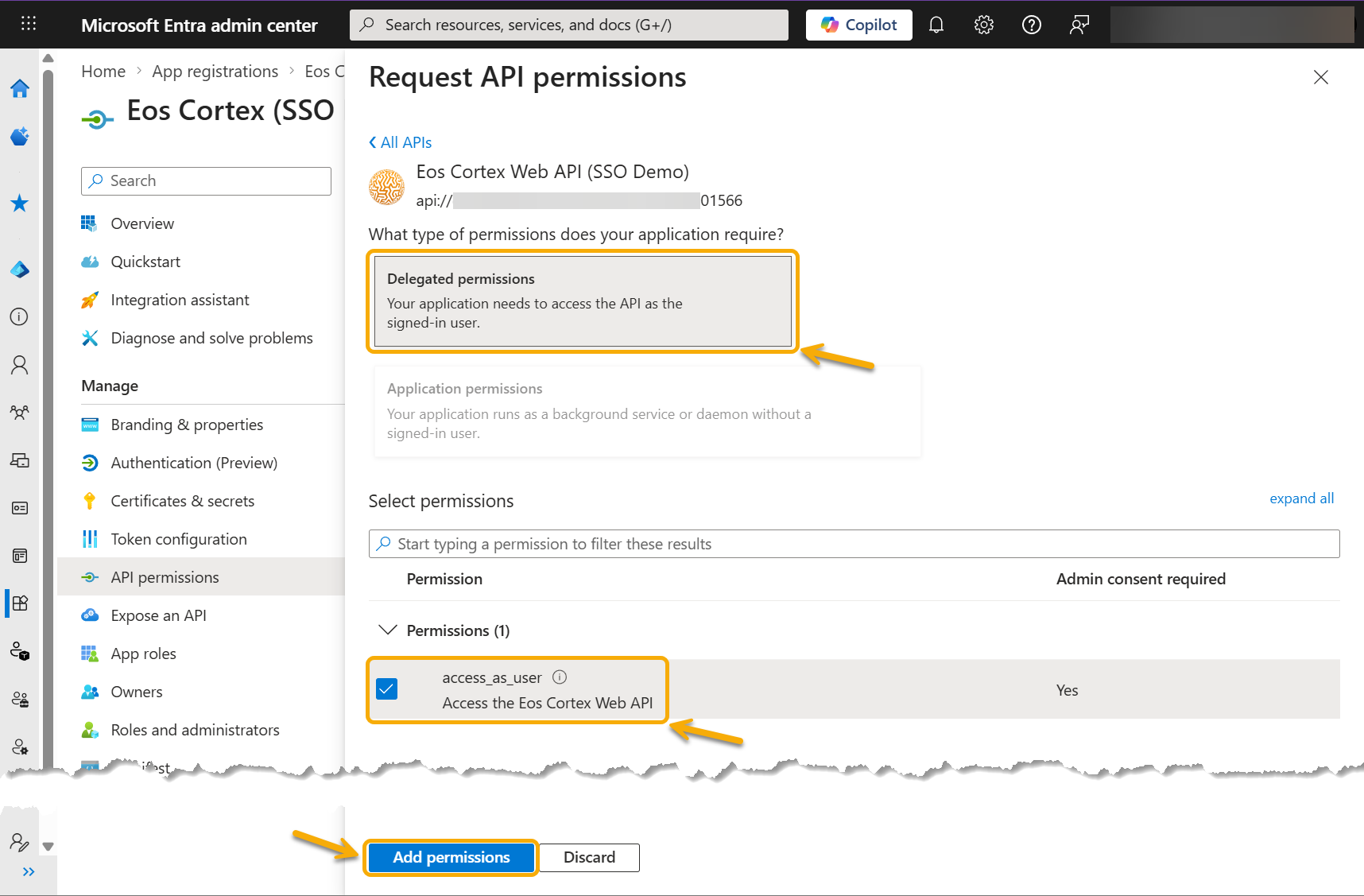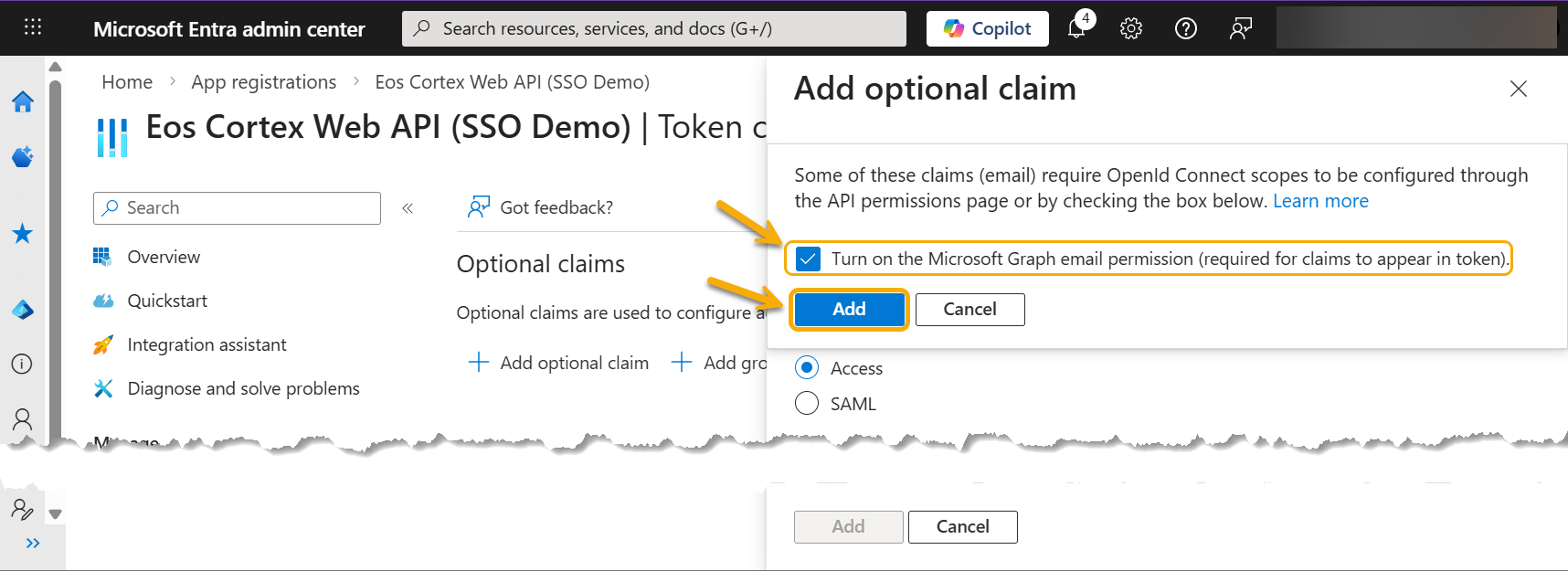 - Add the Entra app: Eos Cortex Web API (SSO Demo)