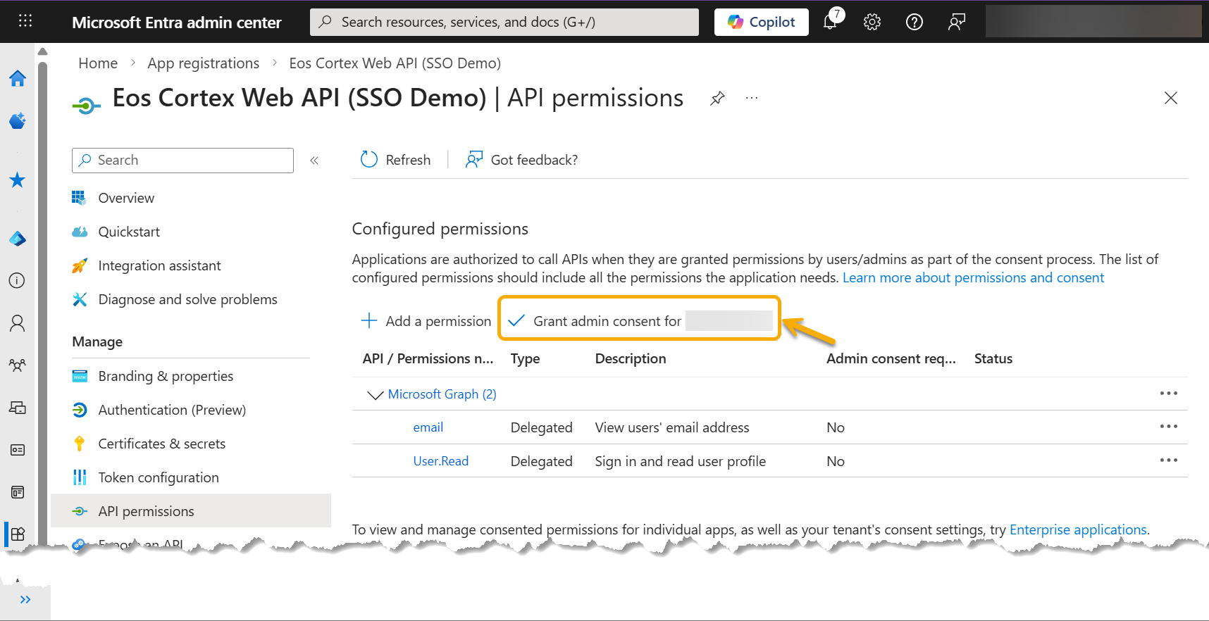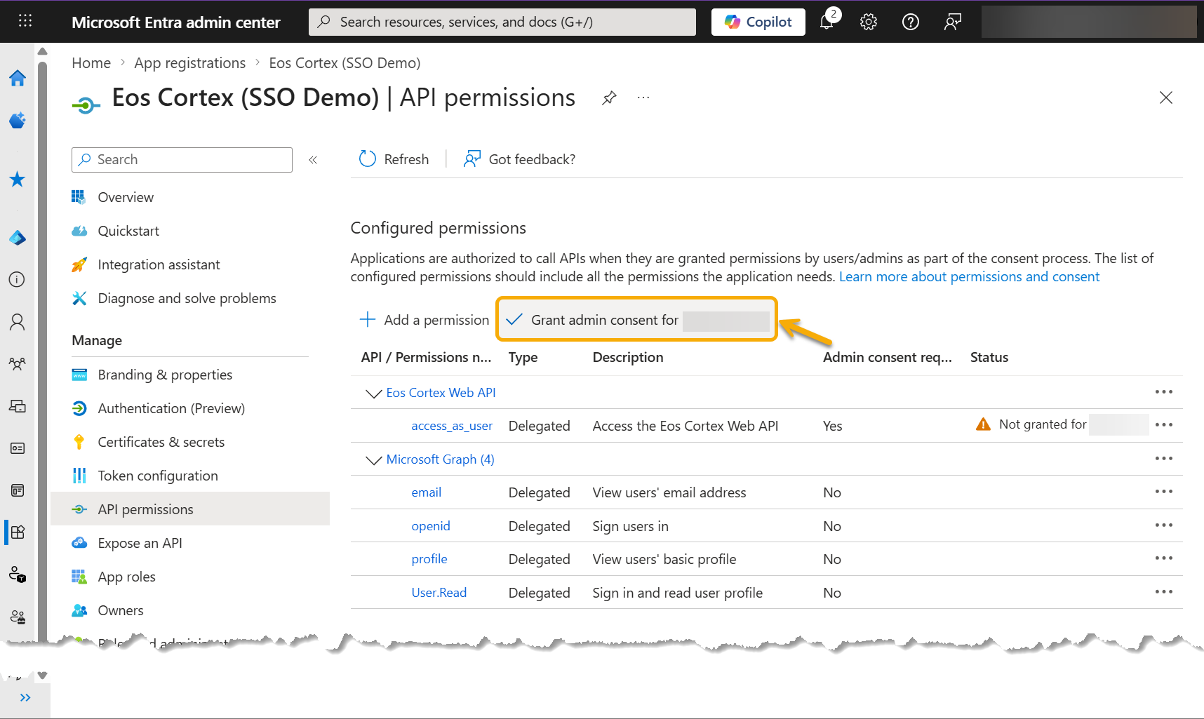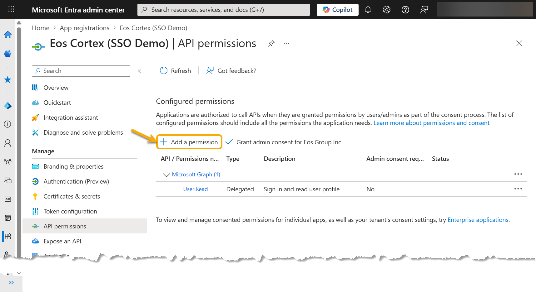 - Add the Entra app: Eos Cortex Web API (SSO Demo)