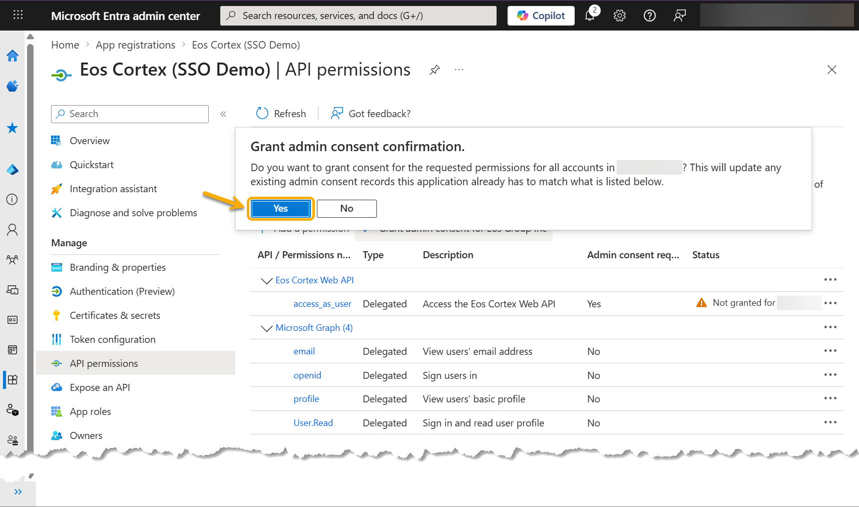 - At the Grant admin consent confirmation dialog, review the message, and select Yes.
