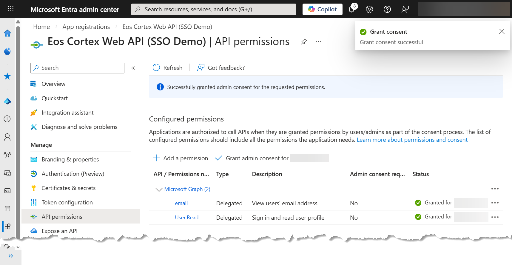 Throughout this solution, "Eos Cortex (SSO Demo)" and "Eos Cortex Web API (SSO Demo)" are used to clearly distinguish between the two Entra apps. These two apps may be named accordingly, to align with your company standard, etc.