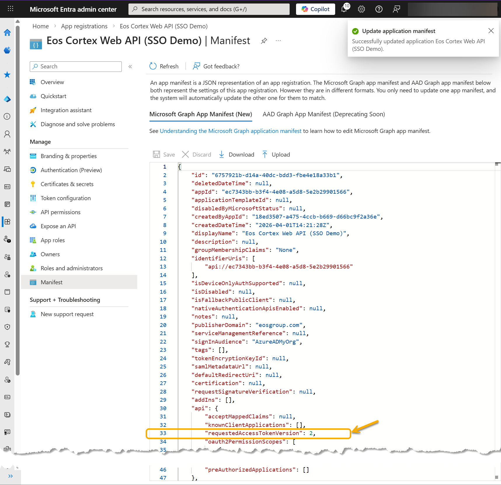 - Scroll down until you find "requestAccessTokenVersion": null, and update the 'null' to '2'. Then select Save.